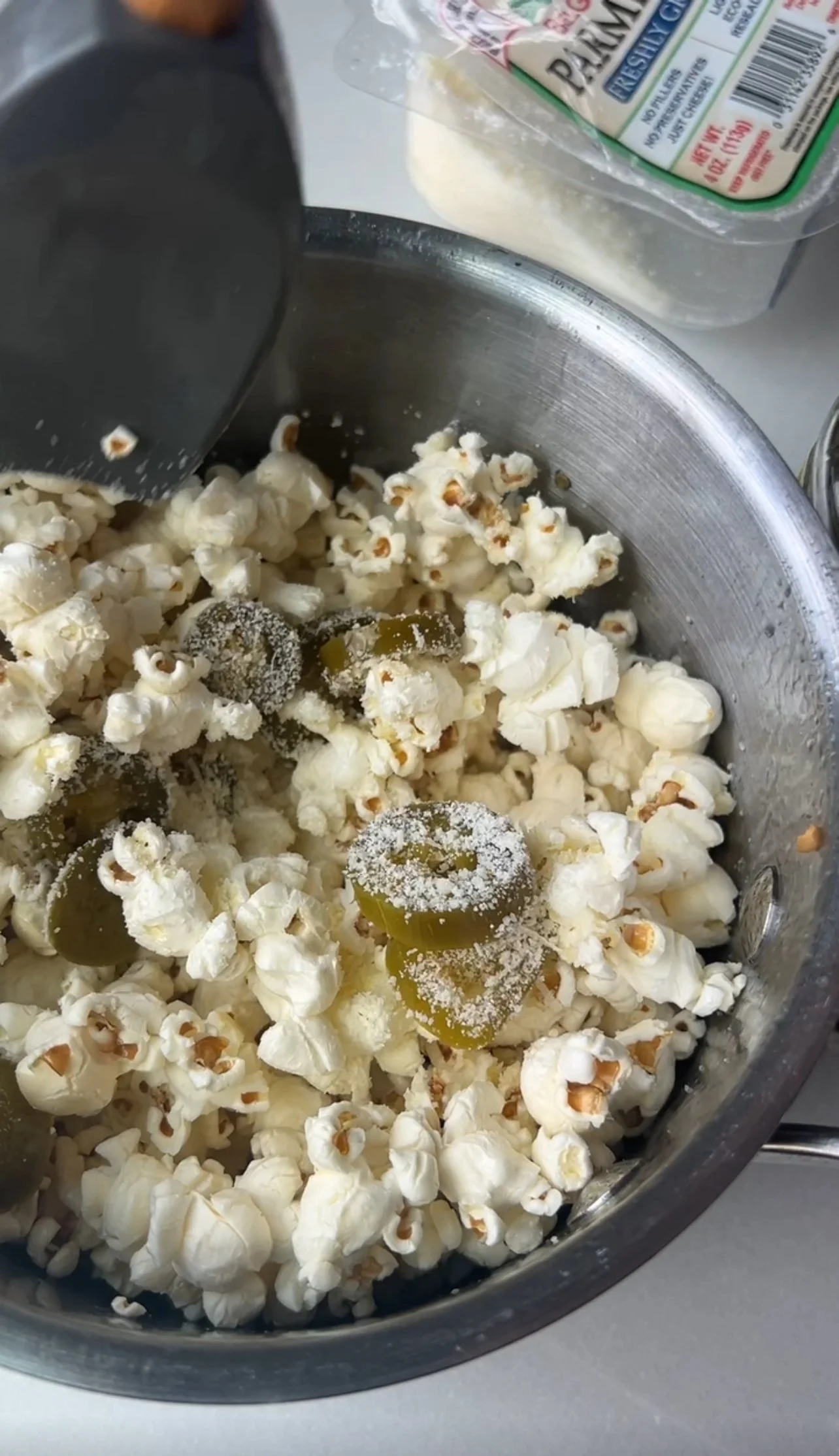 Spicy Parmesan Popcorn Jun 27 Written By Jenny Oertell 4 cups of popped organic popcorn (or 2 Tbsp unpopped kernels)1/4 cup pickled jalapenos1/4 cup grated parmesan cheeseMix hot popcorn with jalapenos and parmesan and enjoy as soon as possible. Jenny Oertell